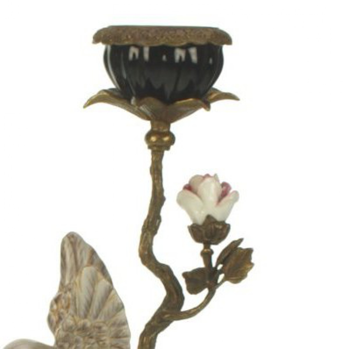 Besonders ausdrucksstark sind die detailreich modellierten Vögel, die sich scheinbar leicht auf den Zweigen niederlassen. Die handbemalten Rosen setzen sanfte Farbakzente und verleihen den Leuchtern eine romantische Note.