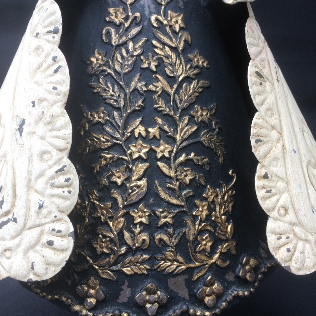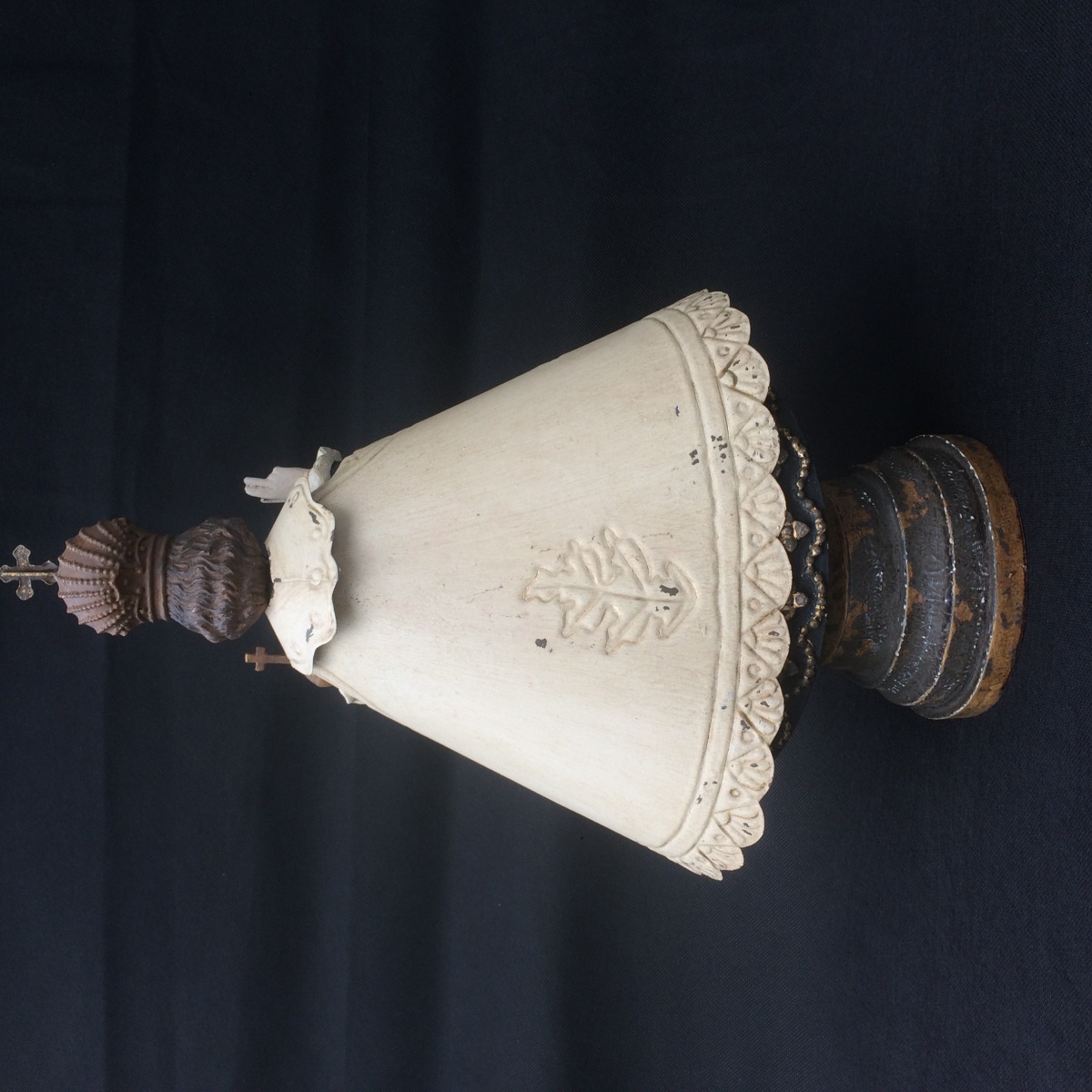 Vorbild für diese fast 40 cm hohe Figur mit sehr schönen Gesichtszügen, altgold farbener Musterpatinierung und crèmfarbenem Umhang aus geprägtem Metall ist das "Prager Jesuskind" aus dem Karmelitenkloster in Prag.