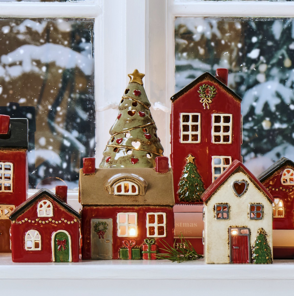 Ein Teelicht im Inneren des von Hand gefertigten, bemalten und glasierten Lichterhäuschen Kopenhagen No2 erhellt und bezaubert in der dunklen Jahreszeit mit poetischen Licht- und Schatteneffekten. Die zauberhaften kleinen Details der Fassaden sind plastisch geformt.