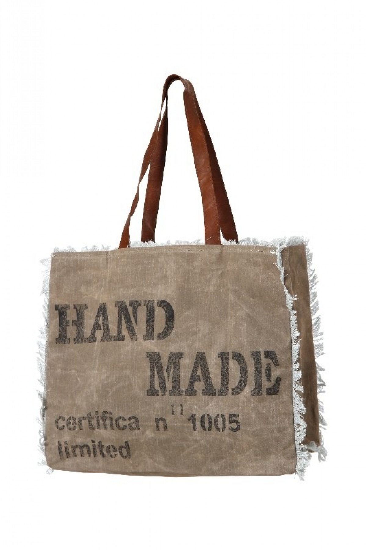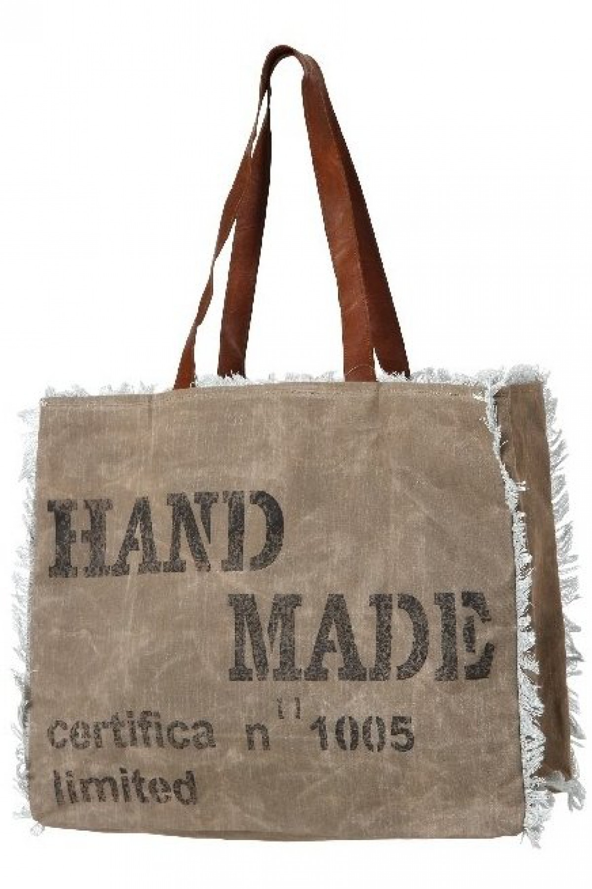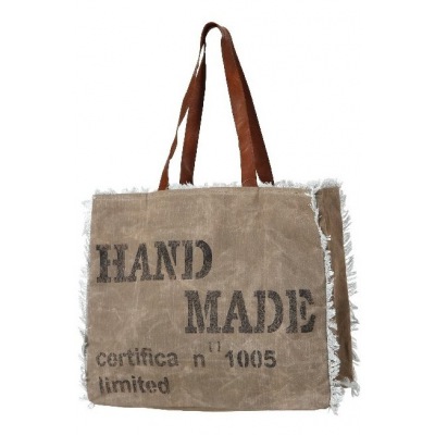 Große Tasche aus robustem Canvasstoff, erfrischend mit blau/weißem Baumwollstoff gefüttert. Lederhenkel.