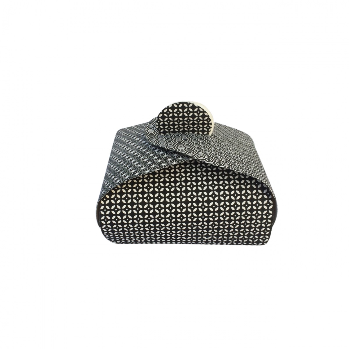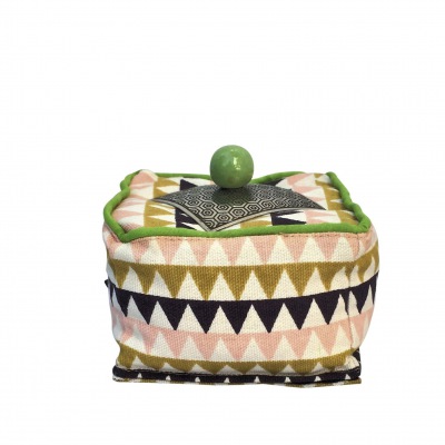 Der Bezug ist aus einem kompakten Baumwollstoff, die gemusterte Metallplaque und die Keramikperle vollenden das moderne Design.
