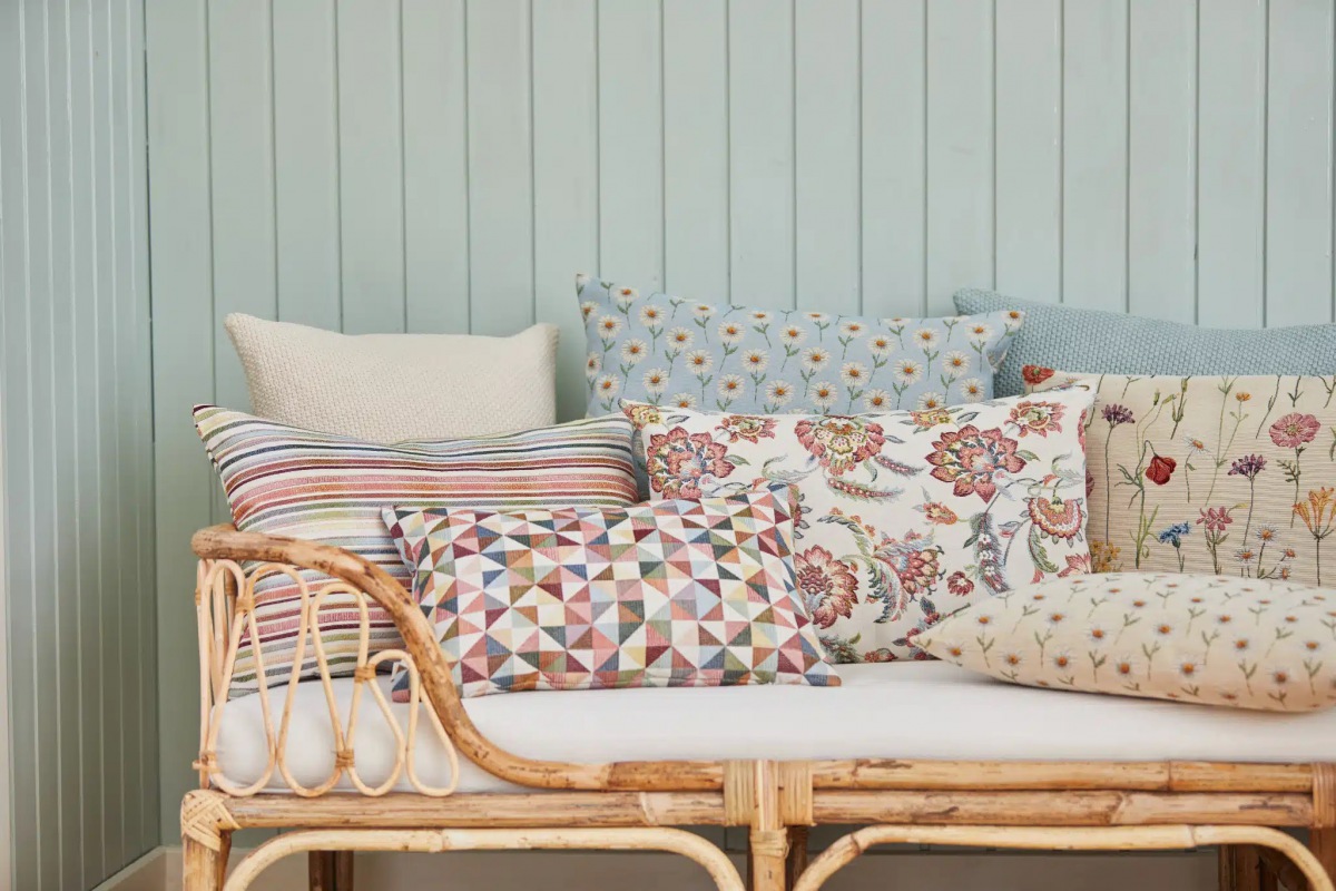Gewebter Gobelinstoff aus 45% Baumwolle/55% Kunstfaser, verdeckter Reißverschluss, waschbar bei 40 Grad, Füllkissen aus dänischen Entendaunen.