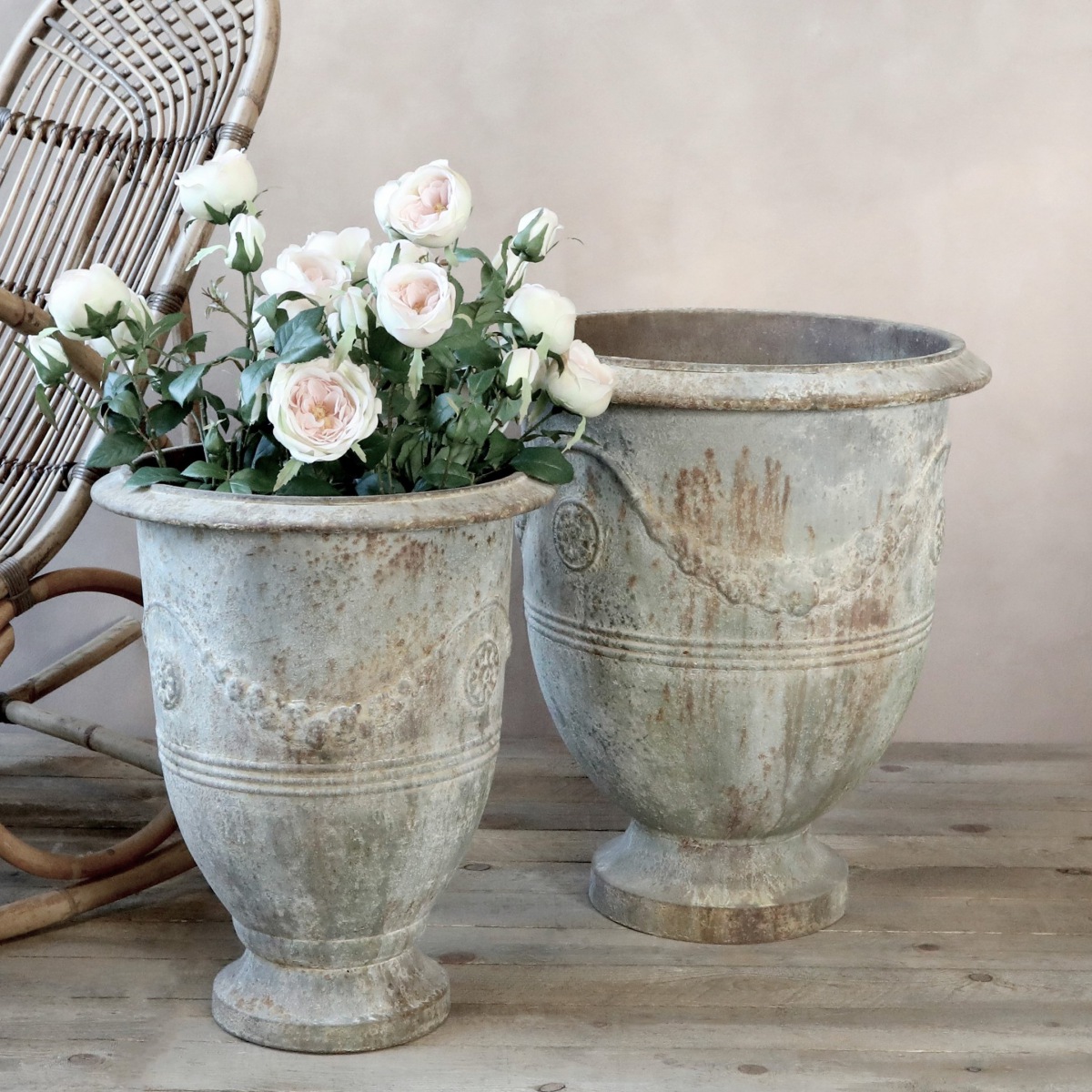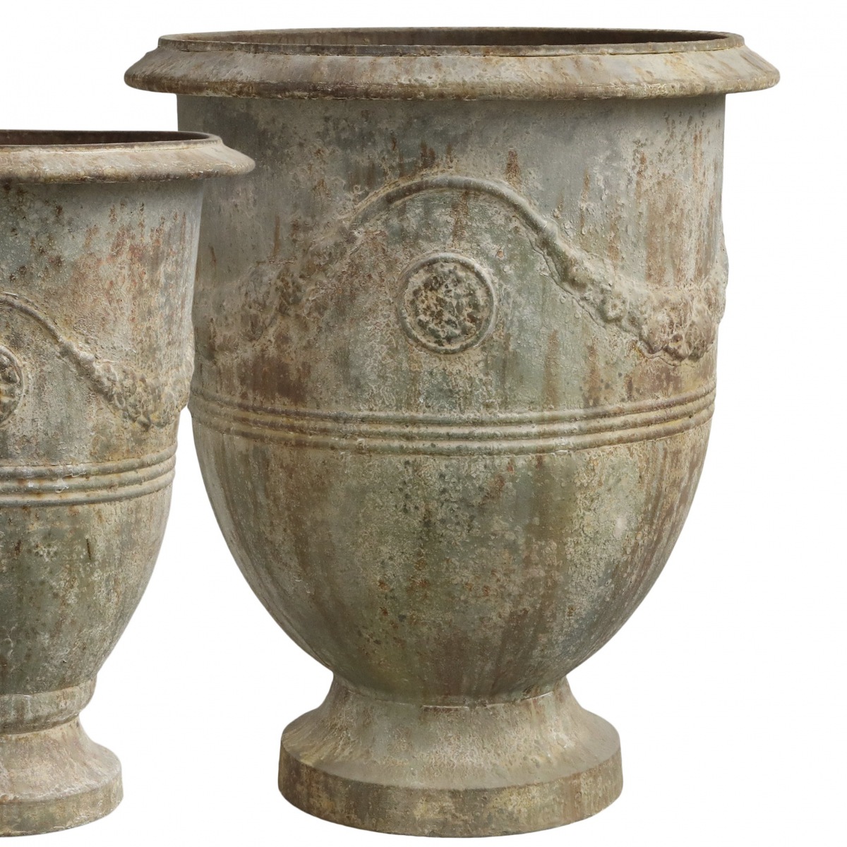 Die Antik Patinierung in unterschiedlichen Nuancen verleiht den prachtvollen Amphoren mit klassischen Formelementen ihren einzigartigen Charme - Giardino romantico.