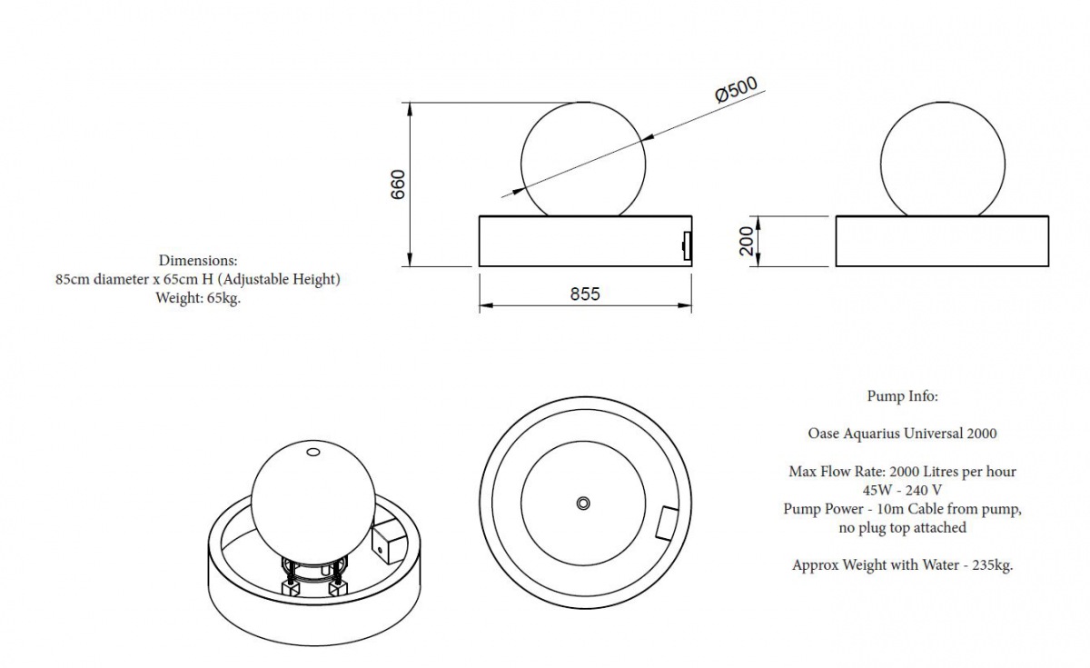 Maße: Kugel ø 50 cm / Becken ø 85 cm, 65 cm hoch, 65 kg