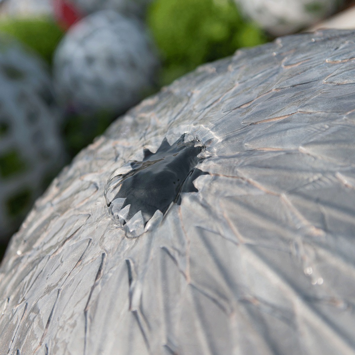 Unzählige einzeln geschnittene Blätter werden von Hand auf einen kugelförmigen Rahmen geschweißt, das Wasser läuft sanft und leise plätschernd entlang der Kugel in das dekorative Becken.