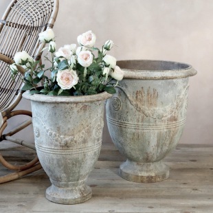Die Antik Patinierung in unterschiedlichen Nuancen verleiht den prachtvollen Amphoren mit klassischen Formelementen ihren einzigartigen Charme - Giardino romantico.