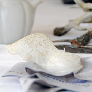 Traumhaft schöne Motivkerze in Form einer Kamelienblüte mit Engelsflügel. Entworfen und gefertigt in Frankreich. Die zarte Goldverzierung des Flügels und der Blüte reflektiert sanft schimmernd das Kerzenlicht.