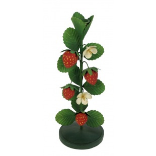 Wunderschöner Kerzenleuchter mit roten Erdbeeren, weißen Erdbeerblüten und formschönem Blättergrün.