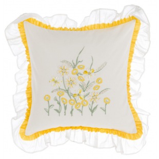 Das Kissen mit dem schönen Margeritenbouquet hat eine feine Doppel-Rüschen Umrandung.