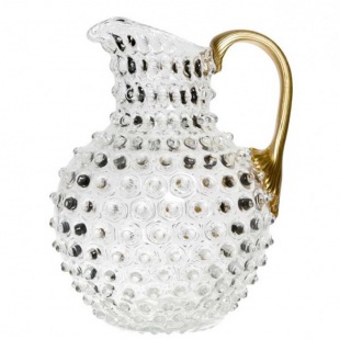 Mundgeblasener Wasserkrug und dekorative Vase aus bleifreiem Kristallglas. Das Hobnail- bzw. Tautropfen Design reflektiert Licht glanzvoll und unterstreicht die Eleganz von  klarem Glas. Der leicht gerillte, goldfarbene Griff ist handlich und wird dem Füllvolumen gerecht.