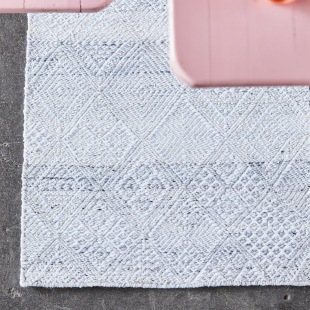 Hochwertige, handgewebte Kunstfaserteppich aus PET haben eine behagliche "Baumwolle-Optik", greifen sich angenehm an, sind formstabil und pflegeleicht. Flecken können abgewischt werden, bei stärkeren Verschmutzungen auch waschbar (die Kunstfaser trocknet schnell, bitte nicht in den Trockner). Geeignet auch für den outdoor-Bereich: eine spezielle UV-Behandlung schützt die Farben.