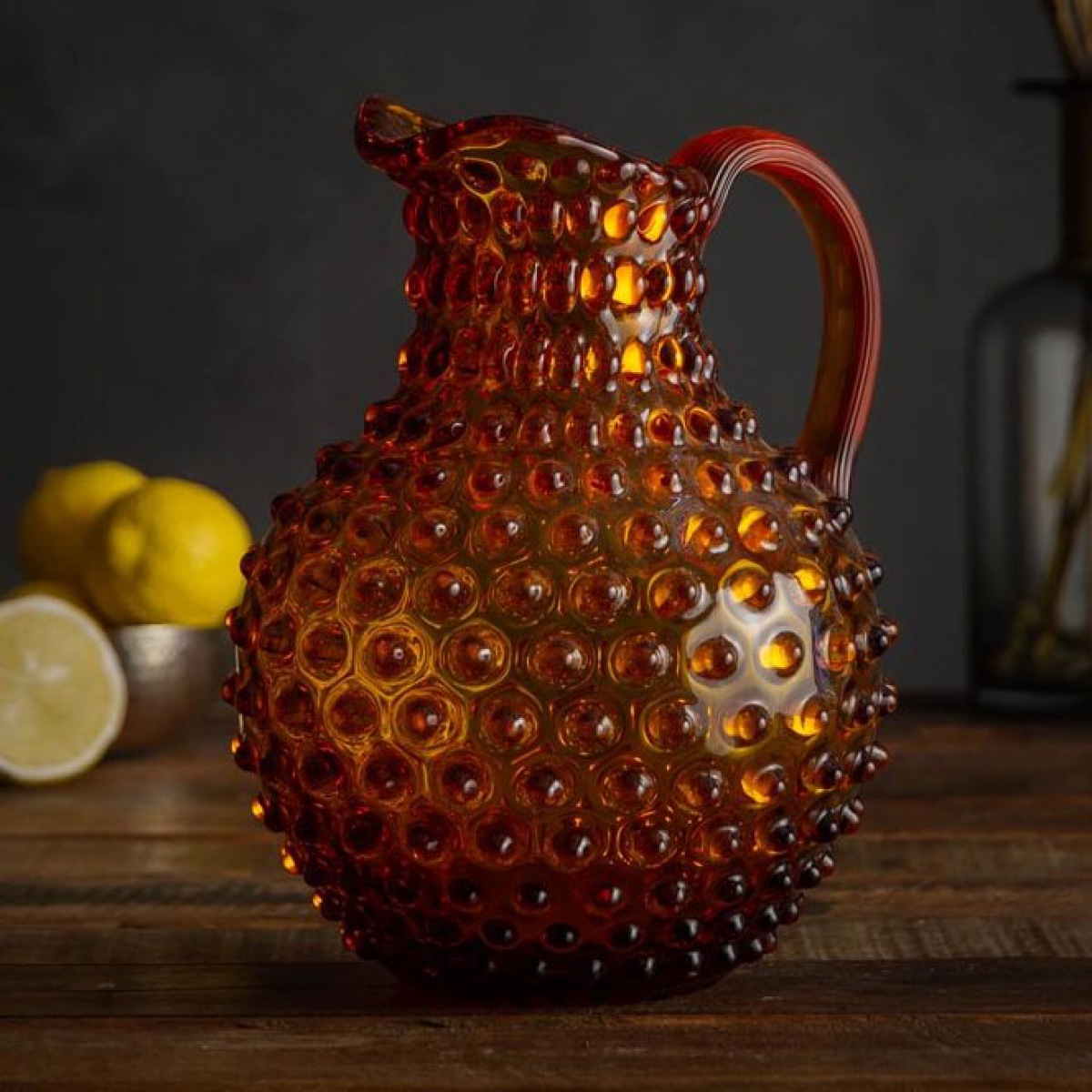 Mundgeblasener Wasserkrug und dekorative Vase aus bleifreiem Kristallglas. Das Hobnail- bzw. Tautropfen Design reflektiert das Licht glanzvoll und unterstreicht die Eleganz von  Glas und die Intensität von Farben. Der leicht gerillte Griff ist besonders handlich und wird dem Füllvolumen gerecht.