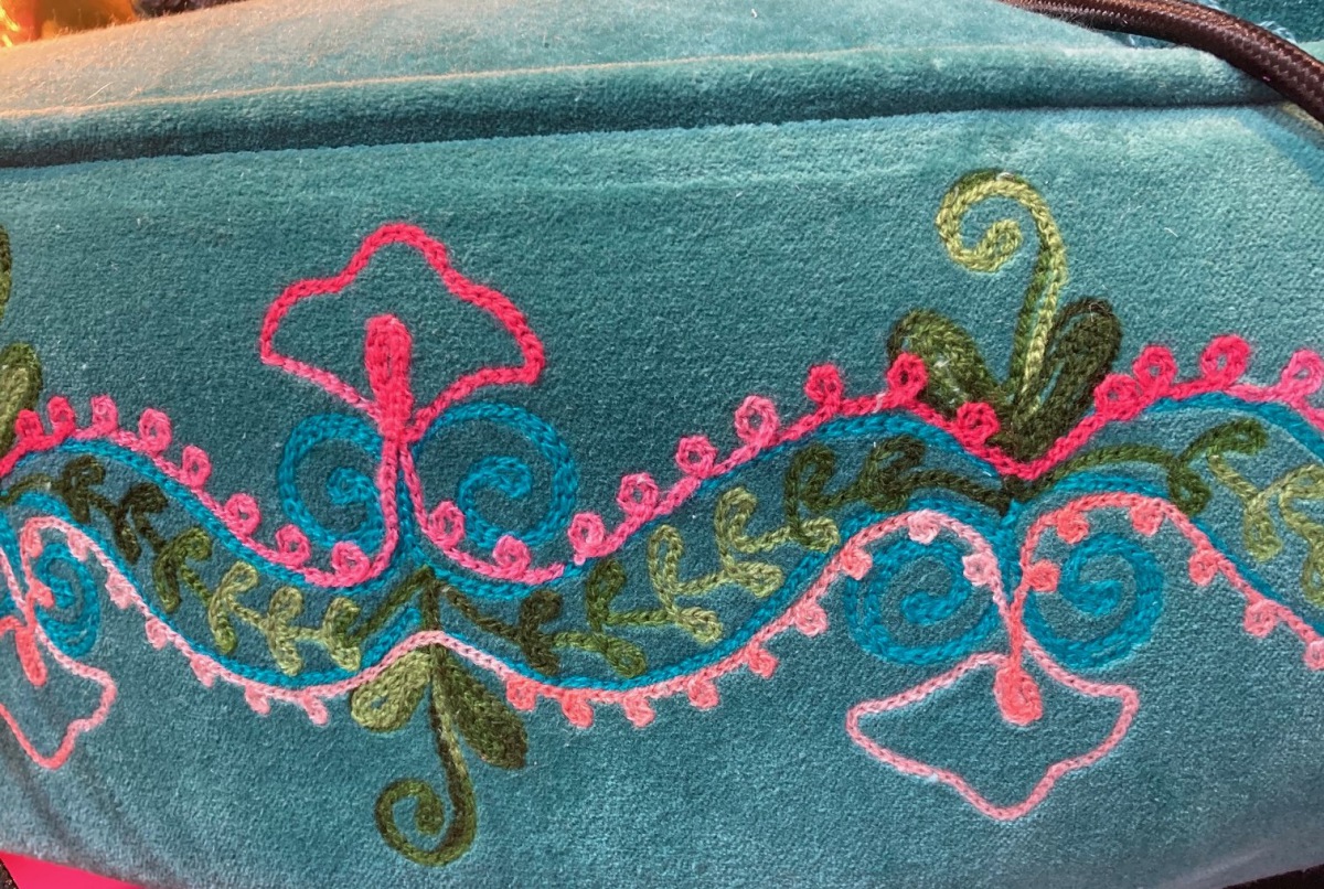 Material: Überzug 100% petrol farbener Baumwollesamt bestickt, Füllung Polyurethan und Polyesterfasern, Gestell Mangifera Indica.