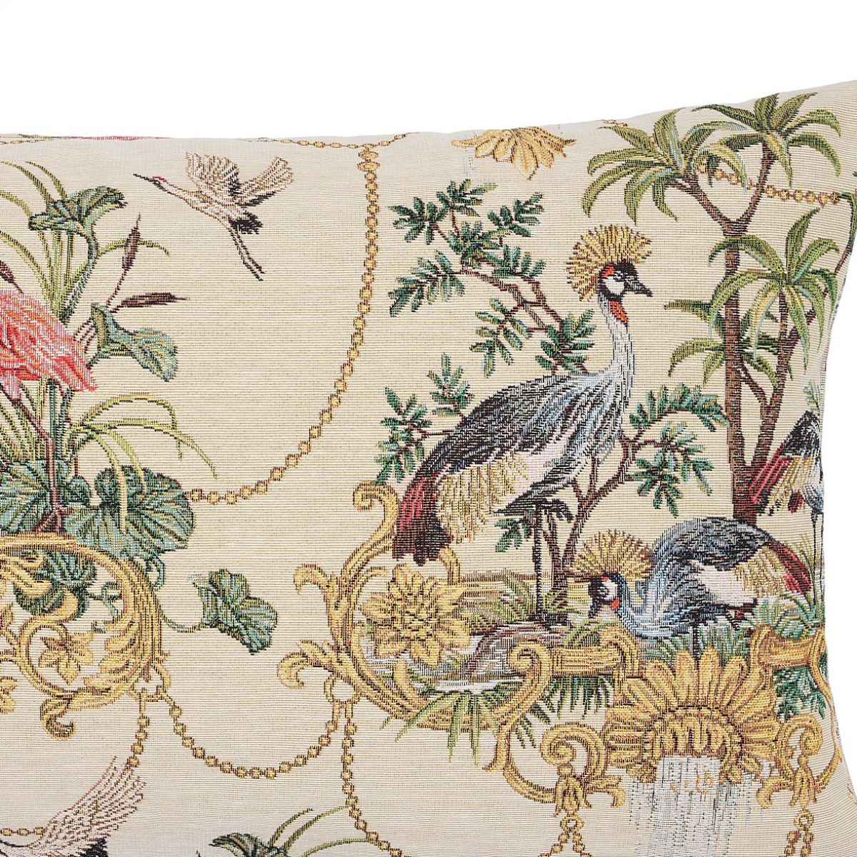 Dieses Gobelin-Kissen ist eine farbenfrohe Hommage an die Vielfalt der Natur. Das Motiv zeigt wunderschön illustrierte exotische Vögel, darunter elegante Flamingos, in lebenigen Farbtönen auf ruhigem beigefarbenem Grund. Das lebendige Motiv sorgt für einen harmonischen und ansprechenden Ausdruck und verleiht Ihrem Zuhause Persönlichkeit und einen Hauch von Exotik.