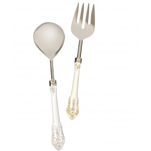 Das elegante Salatbesteck ergänzt edel jedes Alltagsbesteck. Die weißen Griffe haben ein geprägtes Muster mit dezenten Silber- und Gold Akzenten.