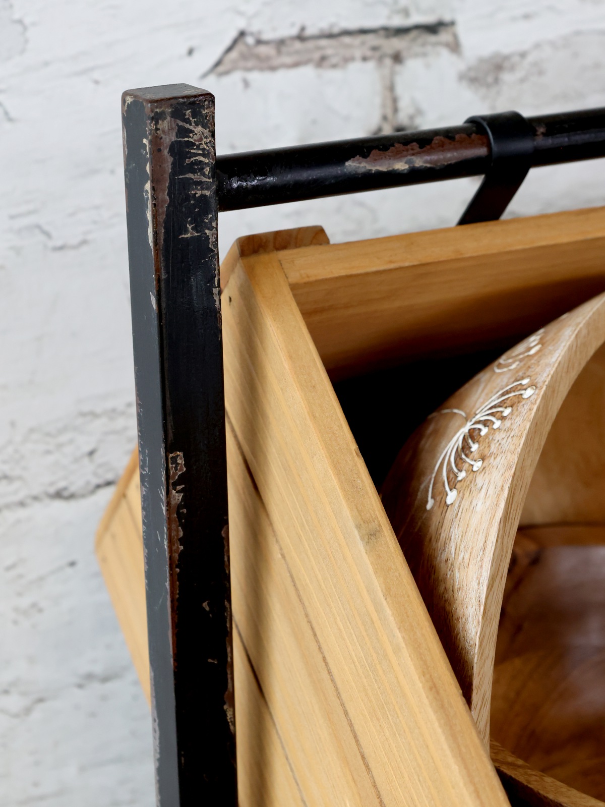 Maße: H104/L50/B34 cm Material: Kiefernholz, Eisen mit dezenter Antik Patinierung