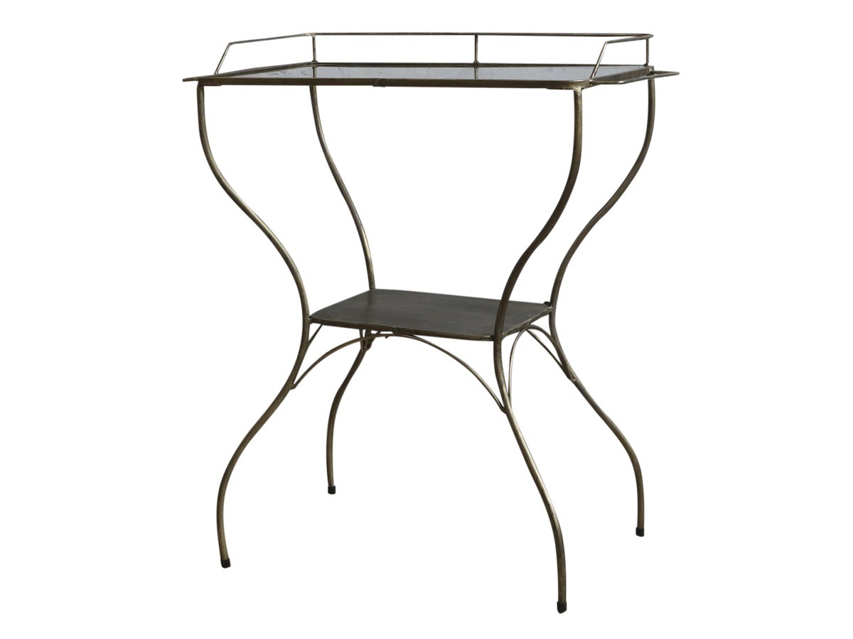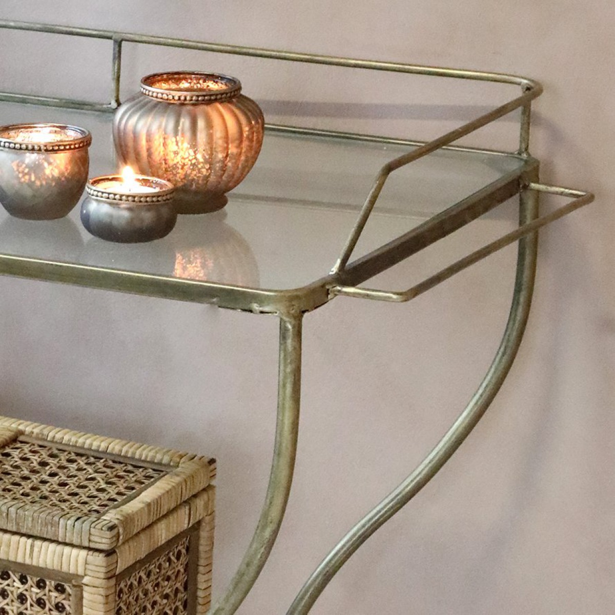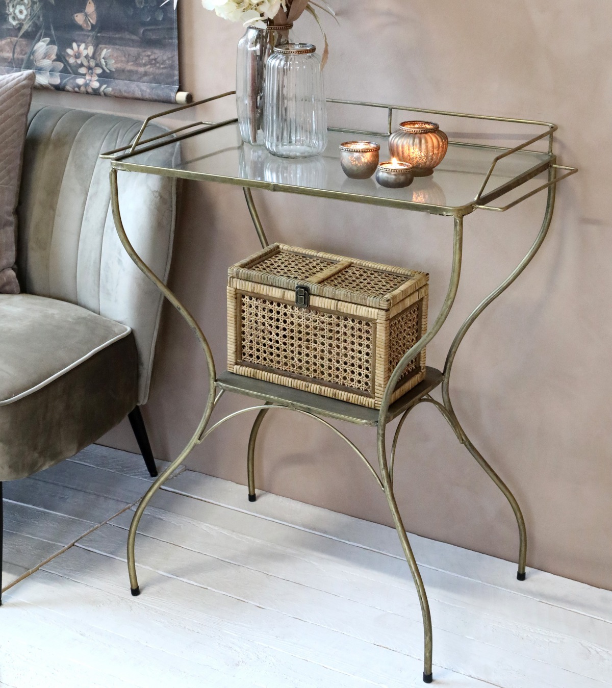 Klassischer, hoher Beistelltisch aus gebürstetem Messing und Glasplatte.