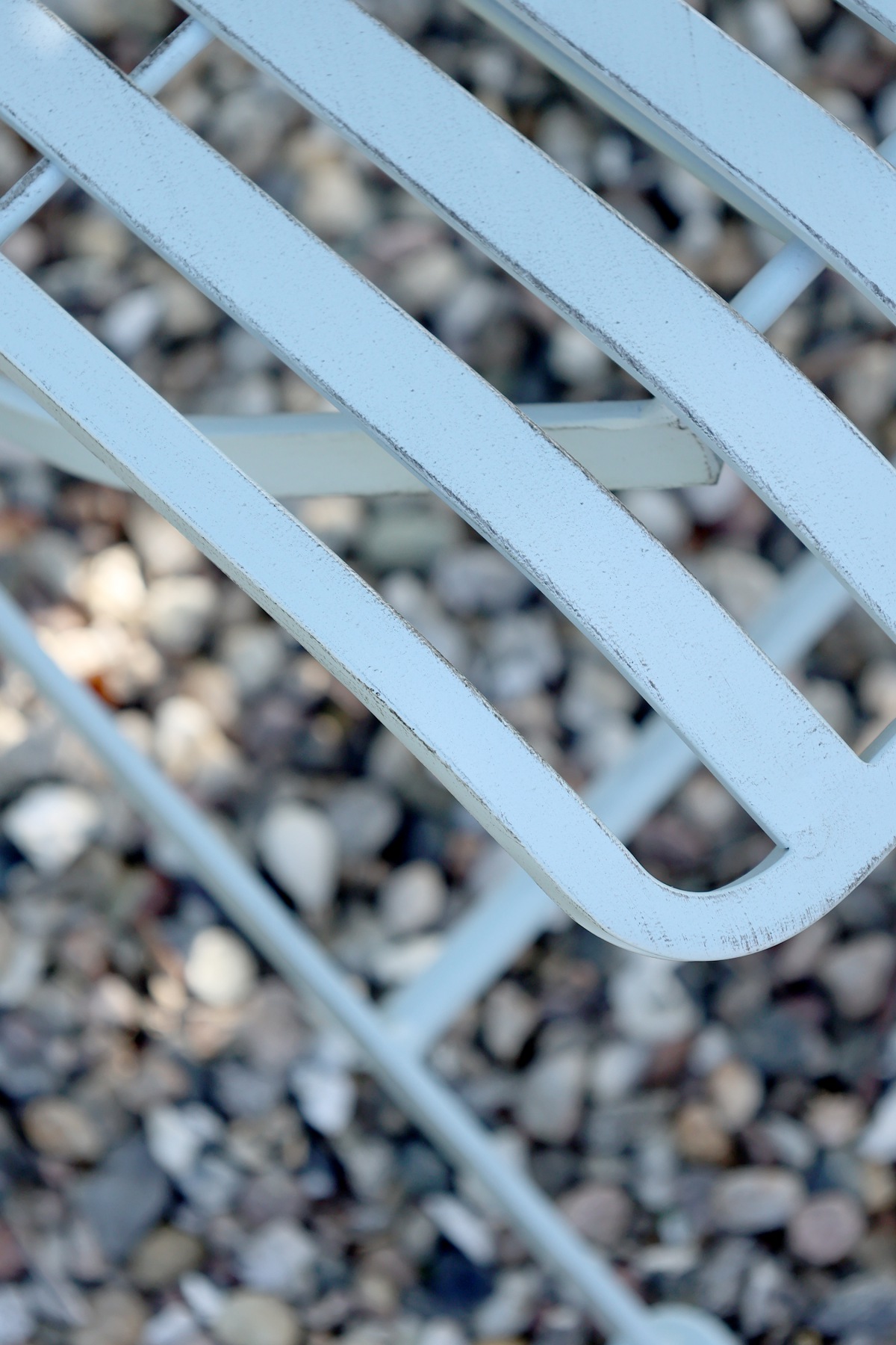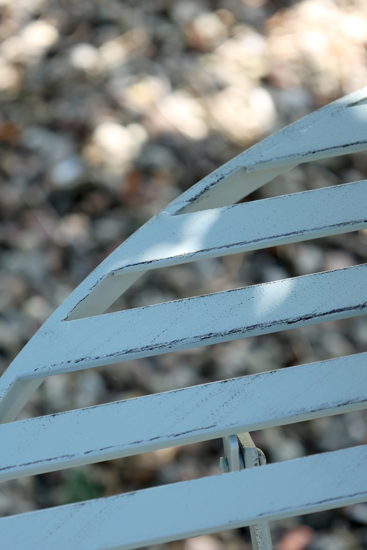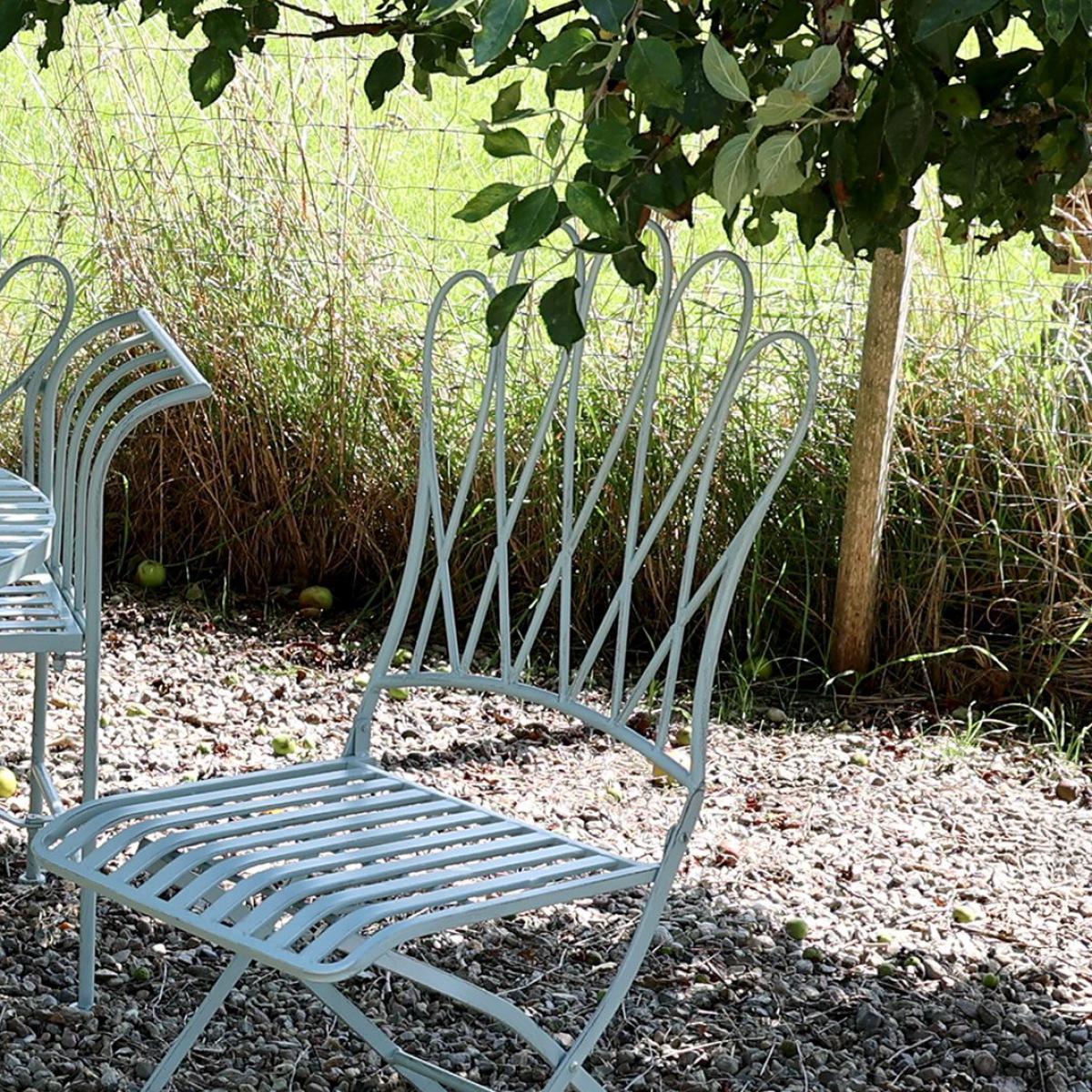 Die Gartenbank mit komfortabler, leicht gebogener Rückenlehne und bequemen Armlehnen bezaubert mit einem wunderschönen hellen Blau, ein sommerlicher, freundlicher Blickfang im Garten und ein Hauch von Normandie-Flair.
