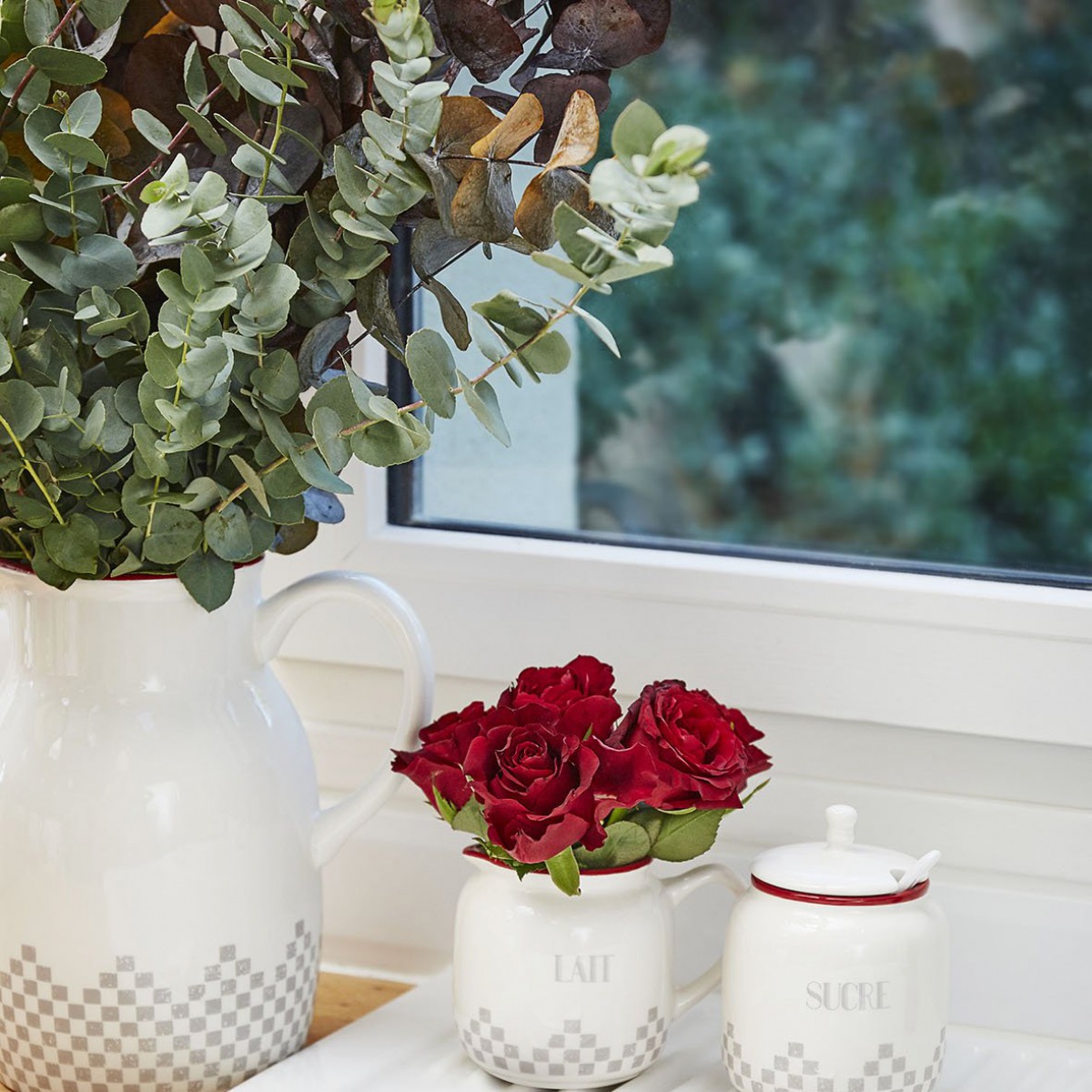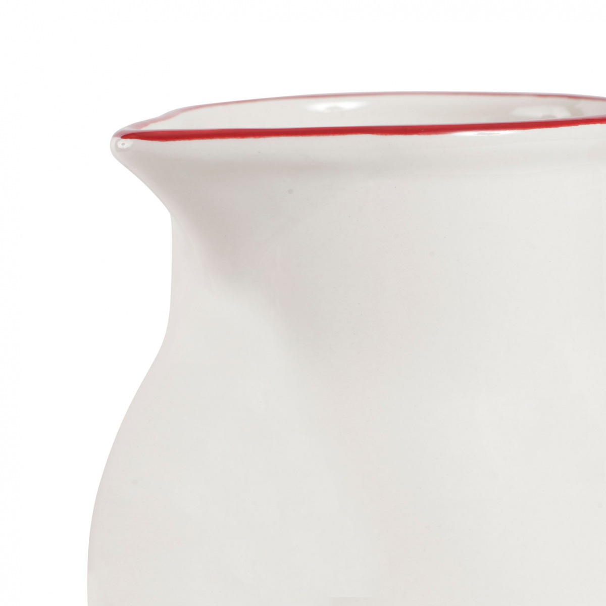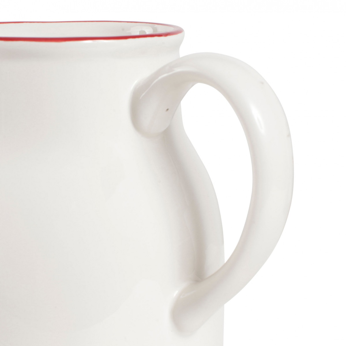 Nostalgischer Krug aus Steingut - unverkennbar Comptoir de Famille mit kirschrotem Rand und klassisch schlichtem Dekormusterrand.
