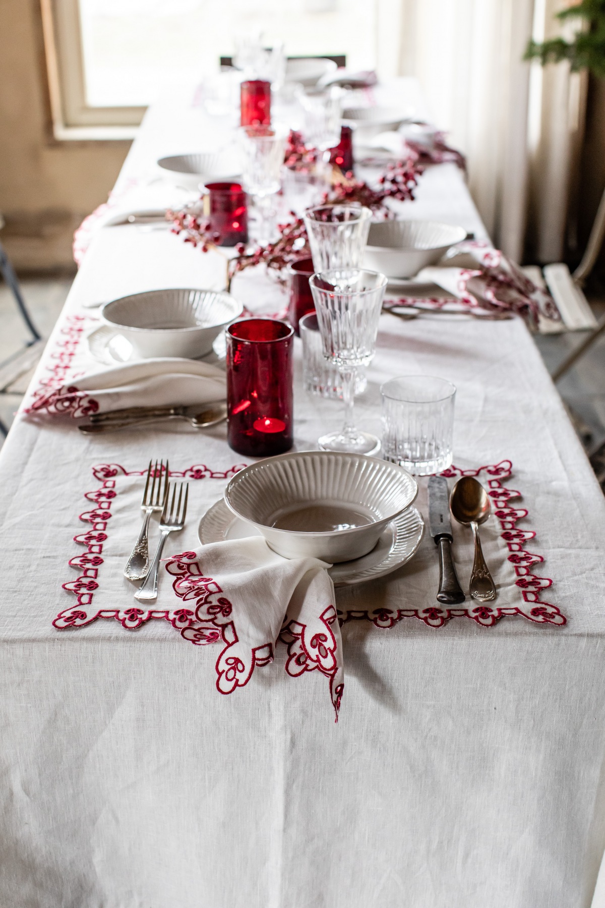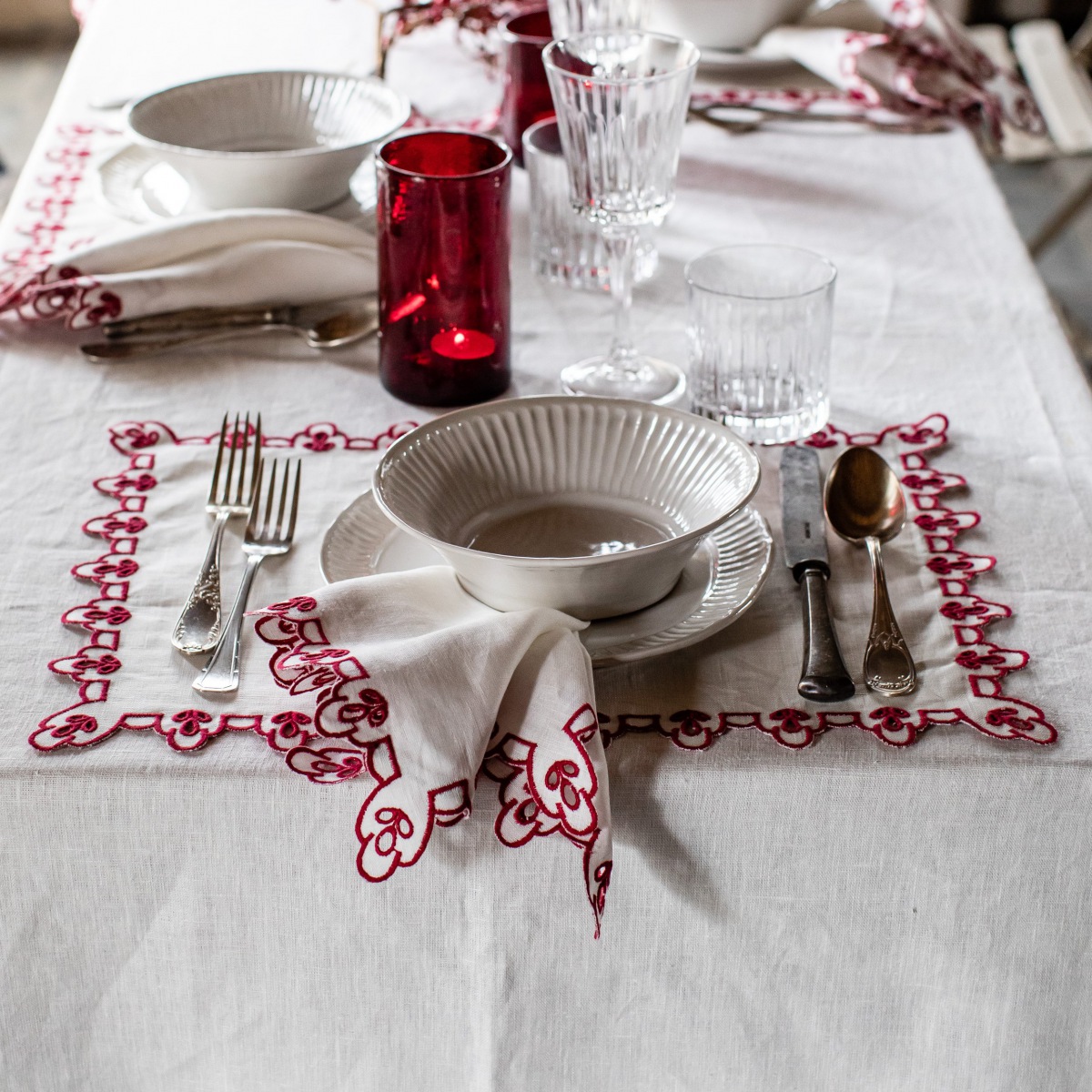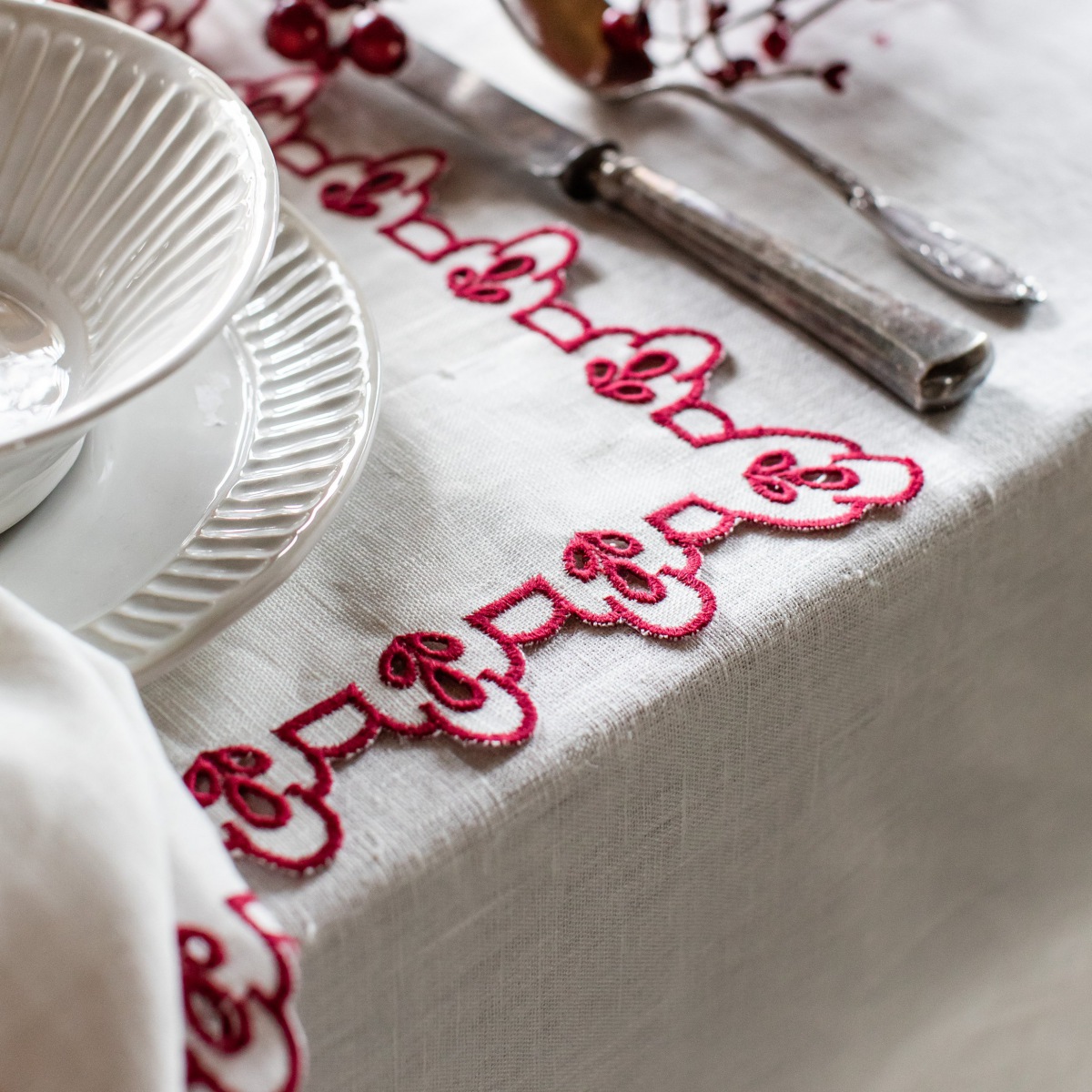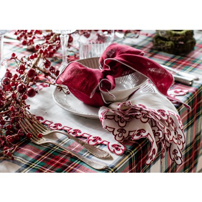 Die akzentuierende Bordüren Stickerei erinnert an stilvolle, nostalgische französische Tischwäsche, immer passend zu jedem Einrichtungsstil und geeignet für jede Jahreszeit.