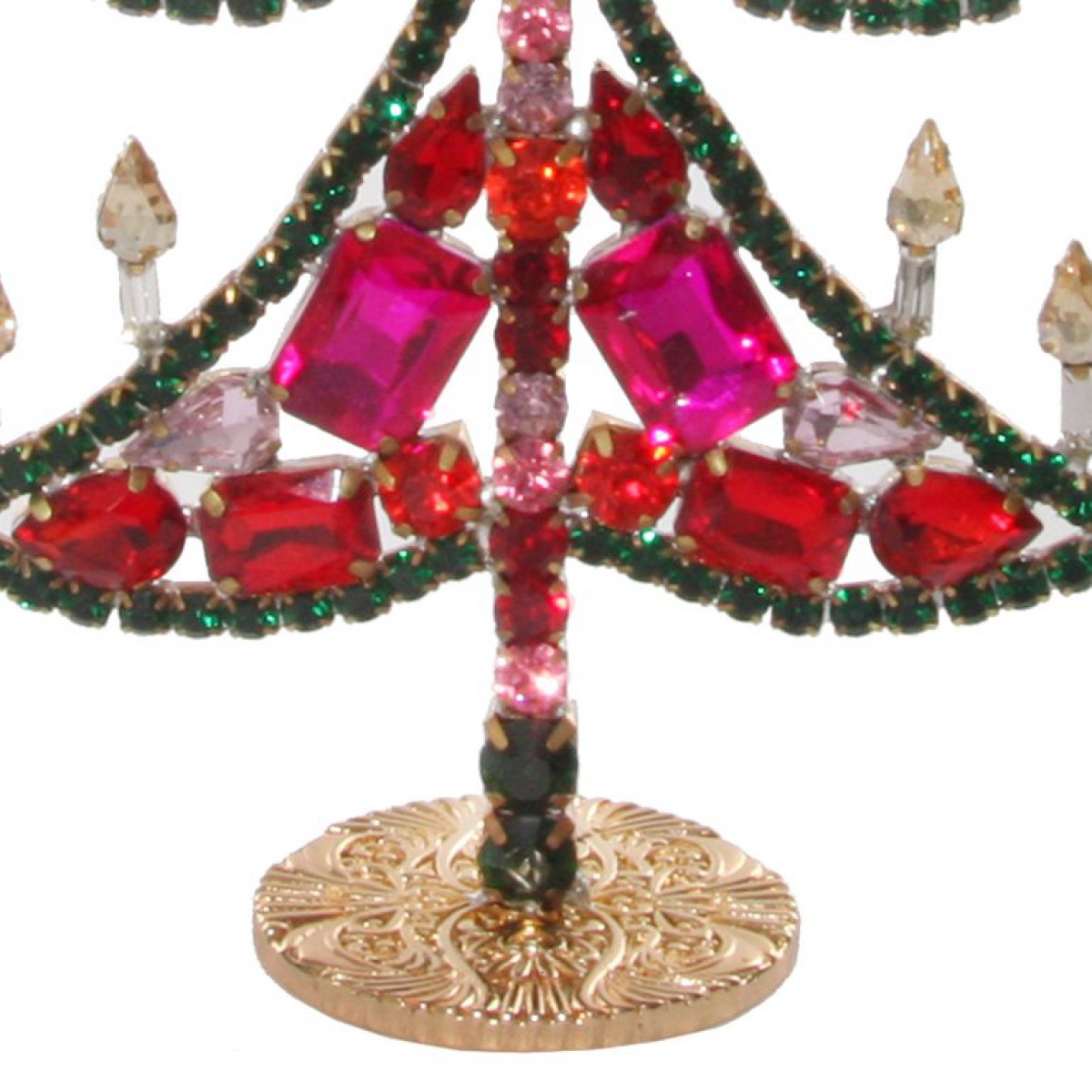 In der Tradition hochwertiger Glasmacherkunst wird auch dieser Gablonzer Retro-Schmuckbaum in Handarbeit gefertigt. Die funkelnden, facettierten Glassteine in Rot- und Grüntönen sind einzeln gefasst, auf der Rückseite ist die Montur komplett messingfarben.