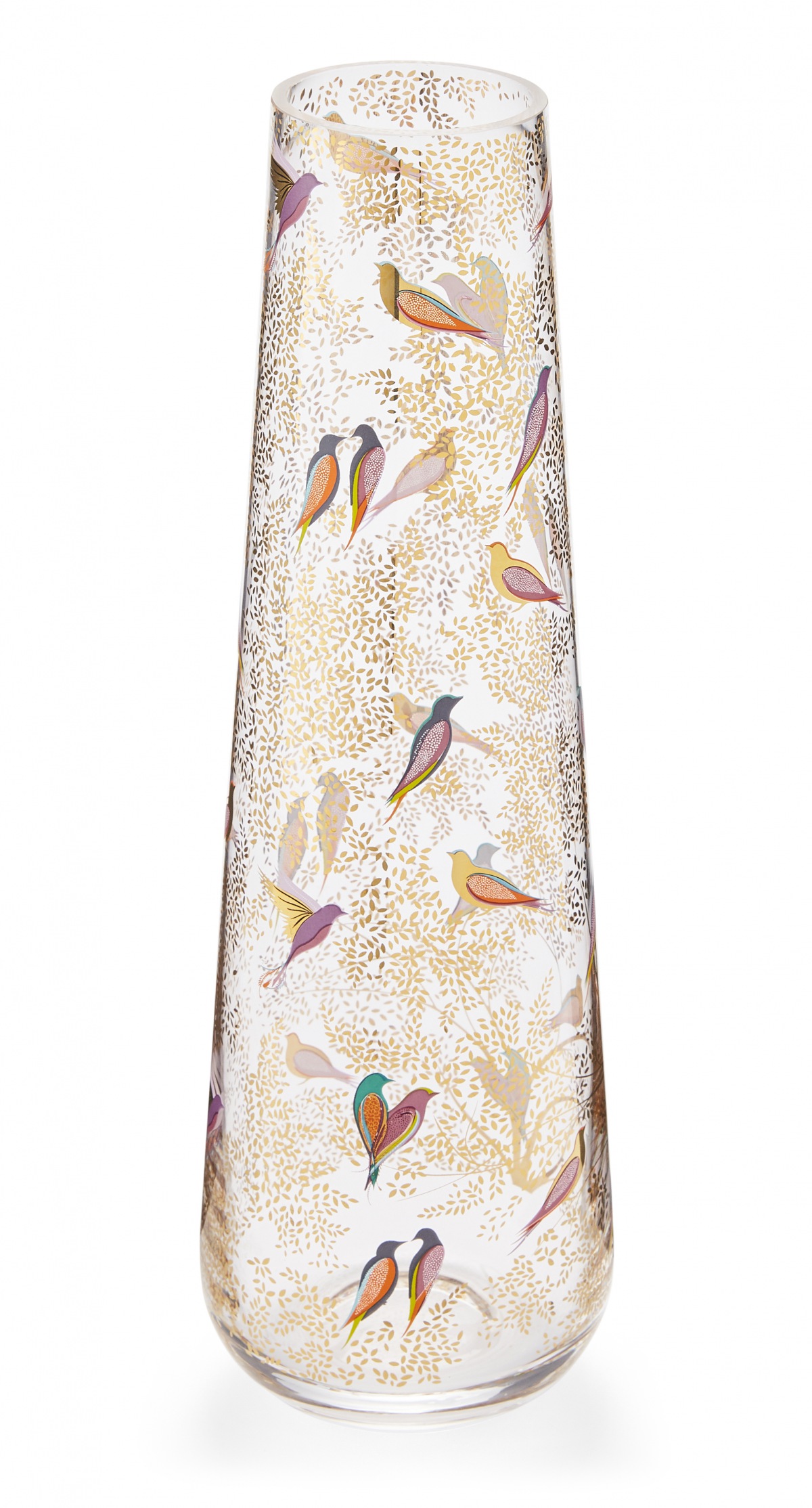 Designervase mit bunten Singvögeln inmitten gold-schimmernden (22 Karat Blattgold) Blättern.