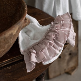 Bella Donna - Weiches Frottee Handtuch, veredelt mit einem Volant aus zarter Leinengaze – ein sinnlicher Genuss, der uns Frauen immer wieder bezaubert.