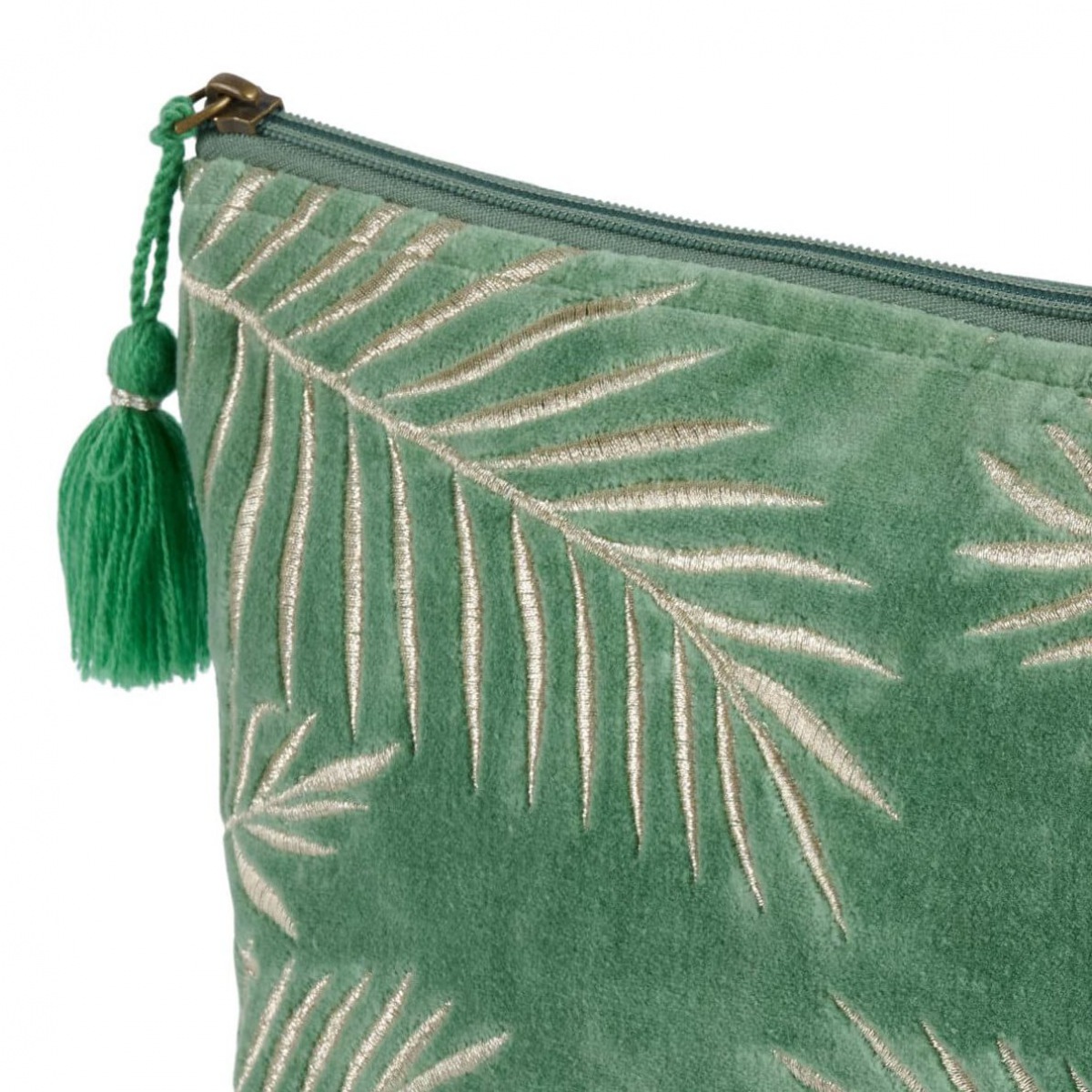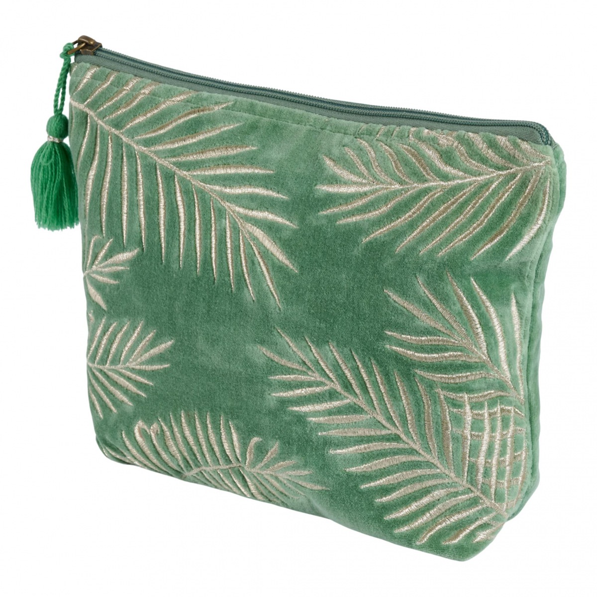 Diese elegante Kosmetiktasche ist aus weichem, samtigem Veloursstoff gefertigt und mit einem wunderschönen silberfarbenen Blattmotiv auf puder-grünem Grund bestickt. Die hübsche Quaste vollendet dieses Lieblingstäschchen.