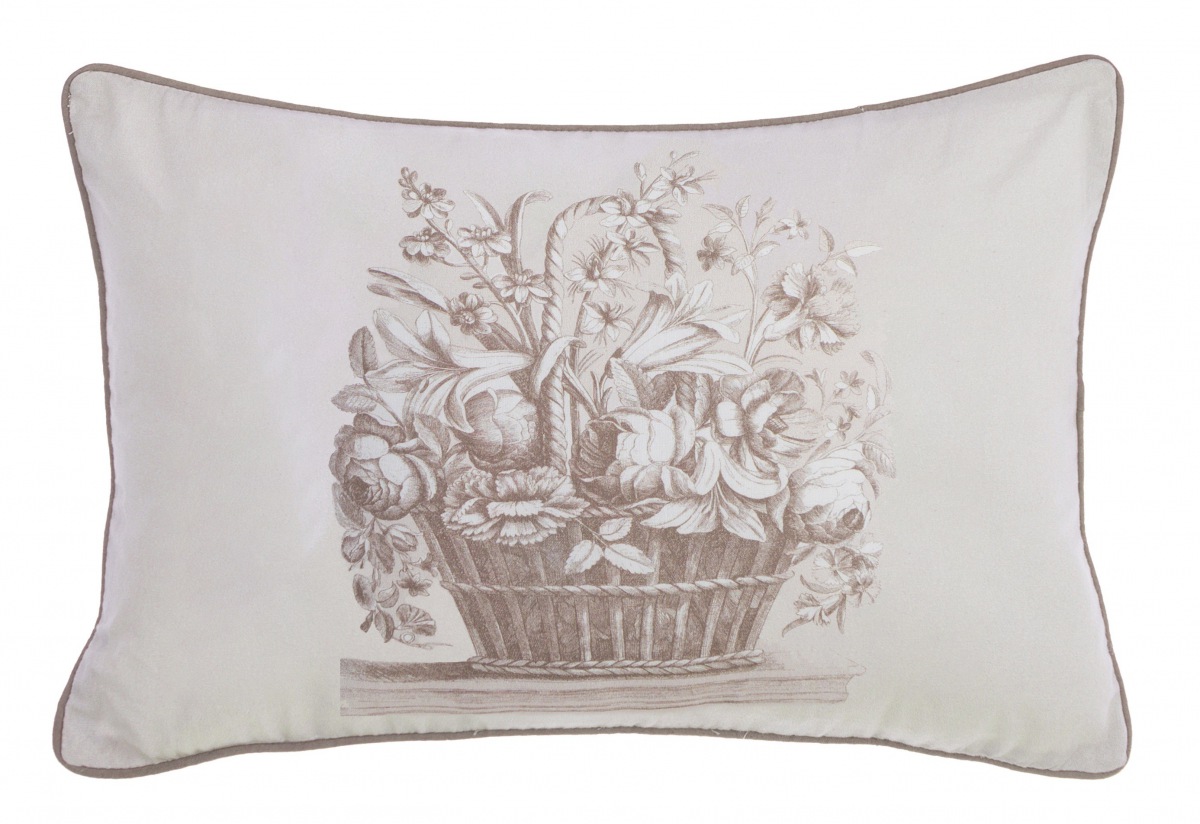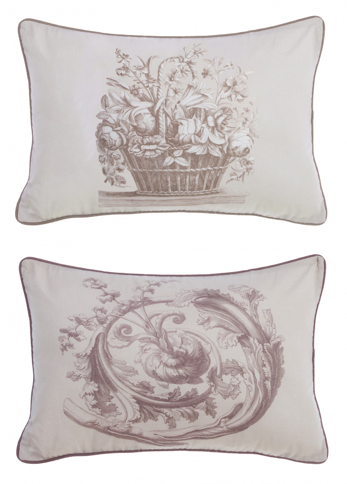 Das Set kombiniert zwei kunstvolle, filigrane Toile-de-Jouy-Motive – einen romantischen Blumenkorb, der reich mit verschiedenen Blumen und Blättern gefüllt ist und ein opulentes barockes Rankenmotiv Ornament – in unterschiedlichem, nuanciertem Taupe-Graubraun auf cremig-weißem Hintergrund.