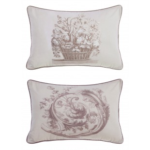 Das Set kombiniert zwei kunstvolle, filigrane Toile-de-Jouy-Motive – einen romantischen Blumenkorb, der reich mit verschiedenen Blumen und Blättern gefüllt ist und ein opulentes barockes Rankenmotiv Ornament – in unterschiedlichem, nuanciertem Taupe bzw. Graubraun auf cremig-weißem Hintergrund.