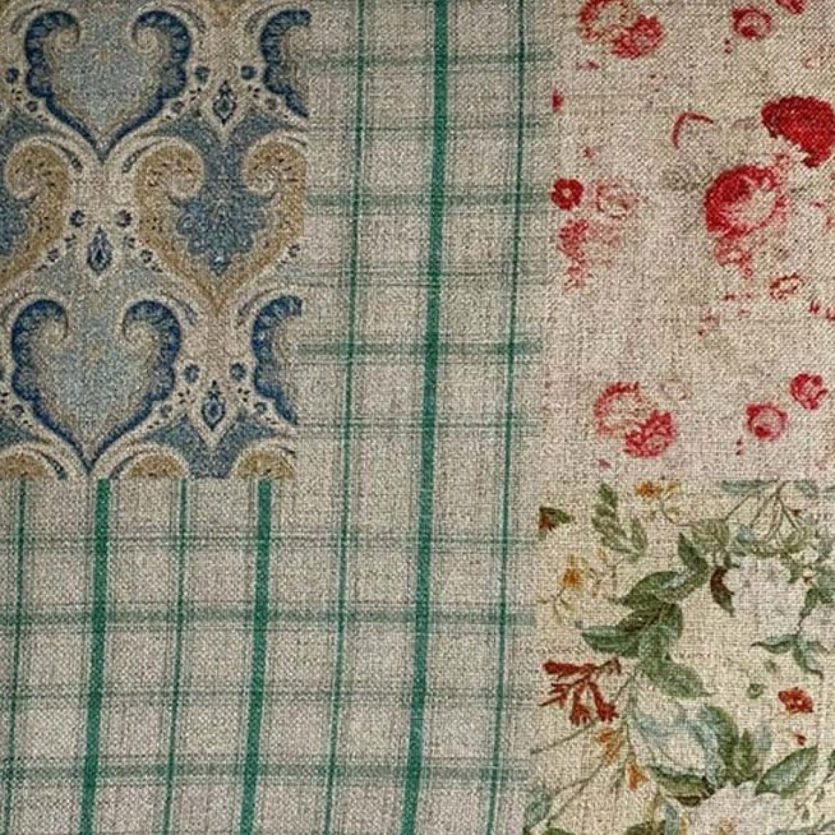 Die hochwertige Kunstfaser hat Leinenoptik und fühlt sich auch wie eine Naturfaser an, der zauberhafte Mustermix kommt dabei wunderschön zur Geltung.