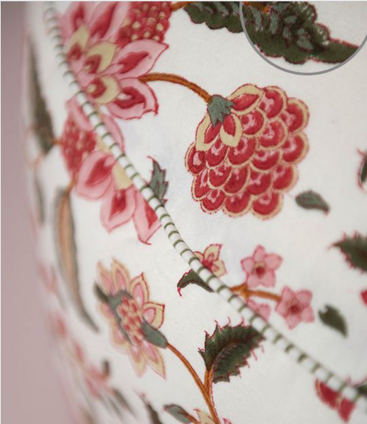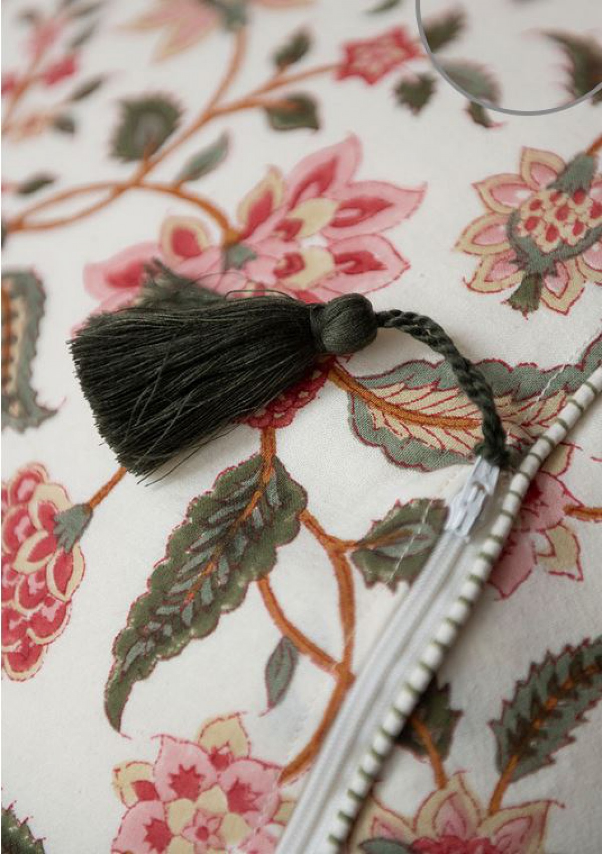 En détail zauberhaft, kleine Quaste und Paspelierung verleihen dem floralen dekorativen Blockprint Muster besonderen Charme.
