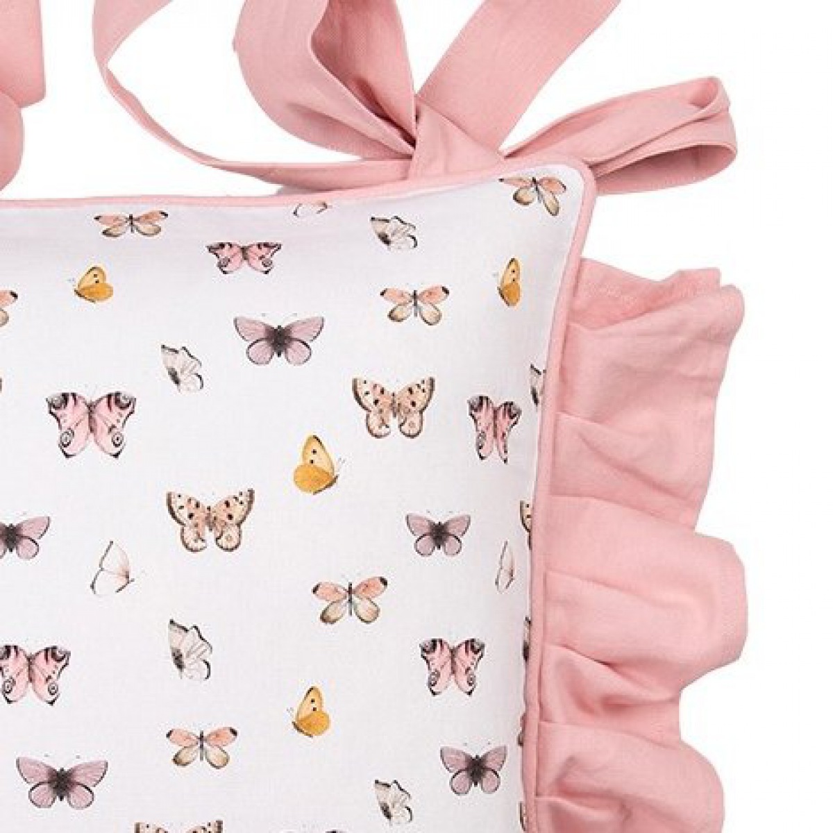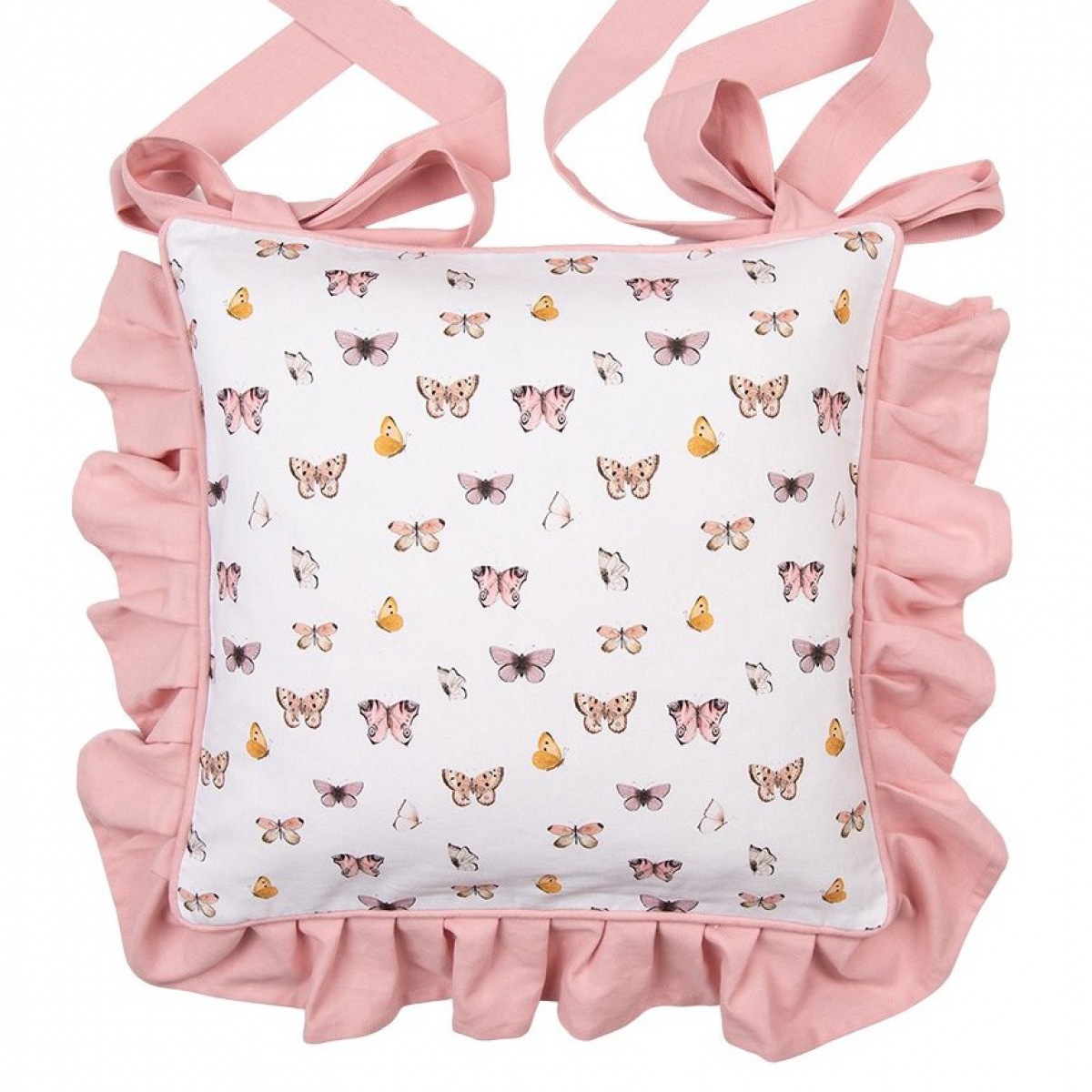 Zauberhafte zarte Schmetterlinge und dekorativer Rüschenrand, die Bändchen fixieren das Polster rutschfest.