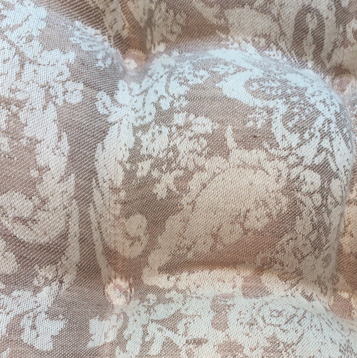 Die feine Borte ergänzt stilvoll das florale Muster der sanften helleren und dunkleren Naturleinen-Farbtöne, auf der Rückseite ist das Sitzkissen unifarben beige.