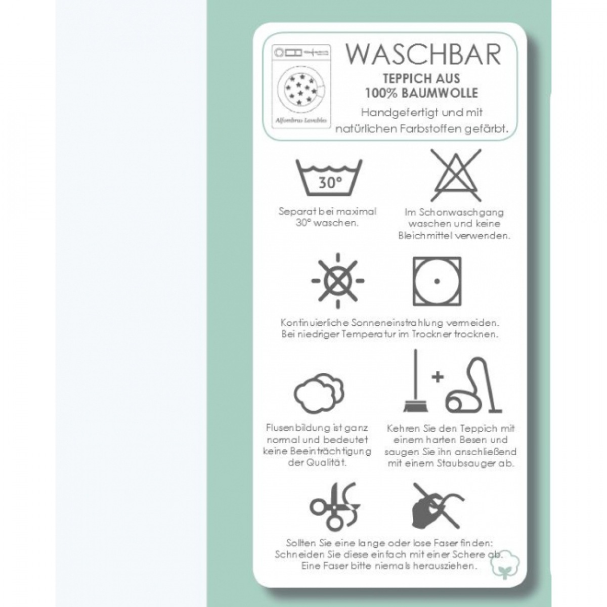 Der handgefertigte Teppich ist aus 100% Baumwolle, es werden nur natürliche
