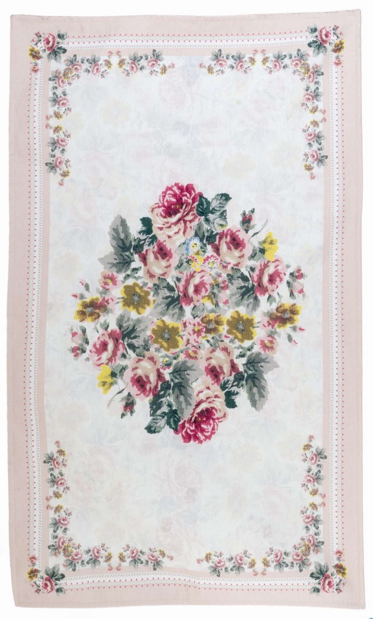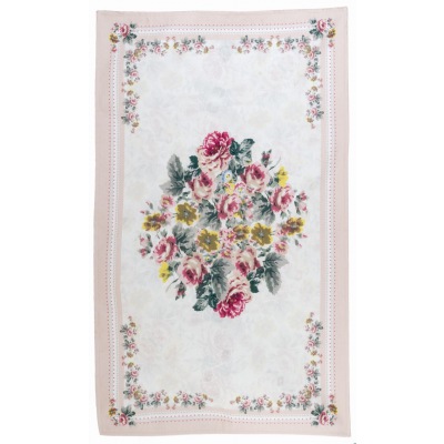 Bezaubernder Veloursteppich, bedruckt mit Rosenblütenranken in eleganten Pastelltönen, hergestellt in Italien. Der feine, leichte Teppich hat auf der Rückseite eine Antirutsch Gummierung und ist waschbar.