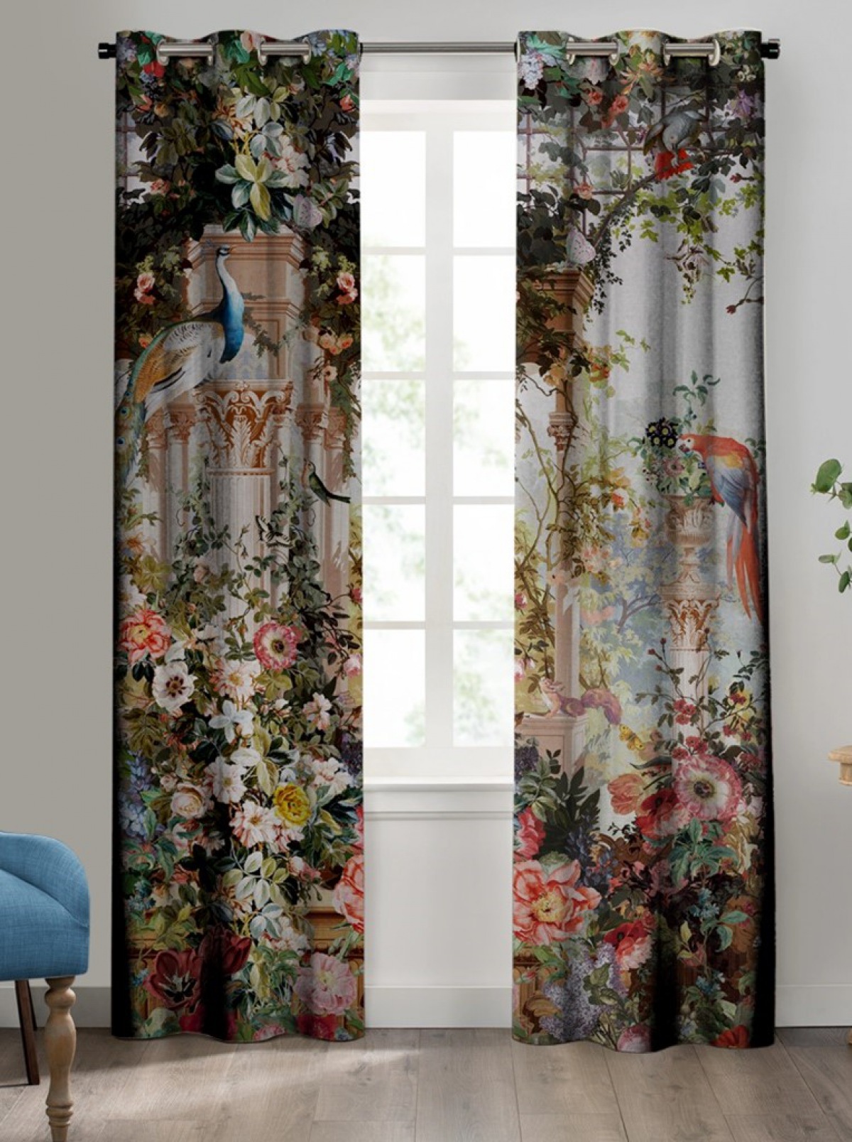 Blickdichter, eleganter, aussergewöhnlicher Vorhang und bildschöner Blick in einen romantischen Garten mit exotischen Vögeln und Pflanzen Opulenz.
